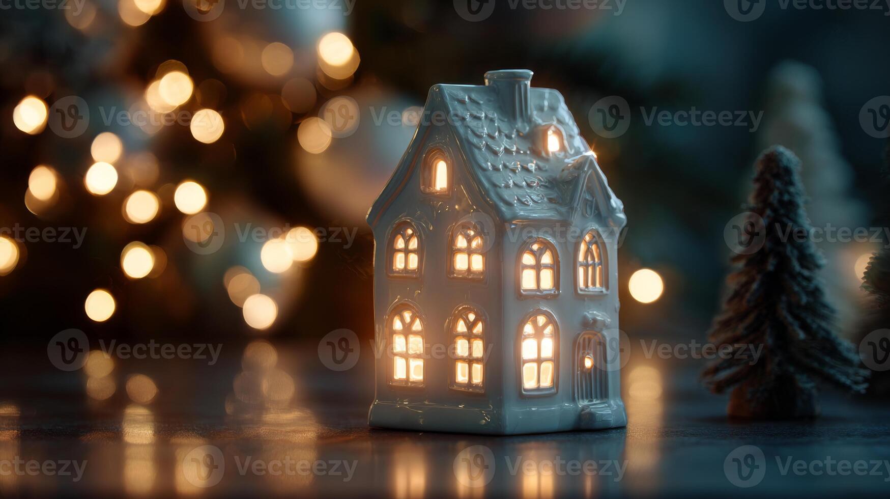A charming ceramic house illuminated from within, surrounded by a festive bokeh backdrop and soft tree decorations. Pro Photo