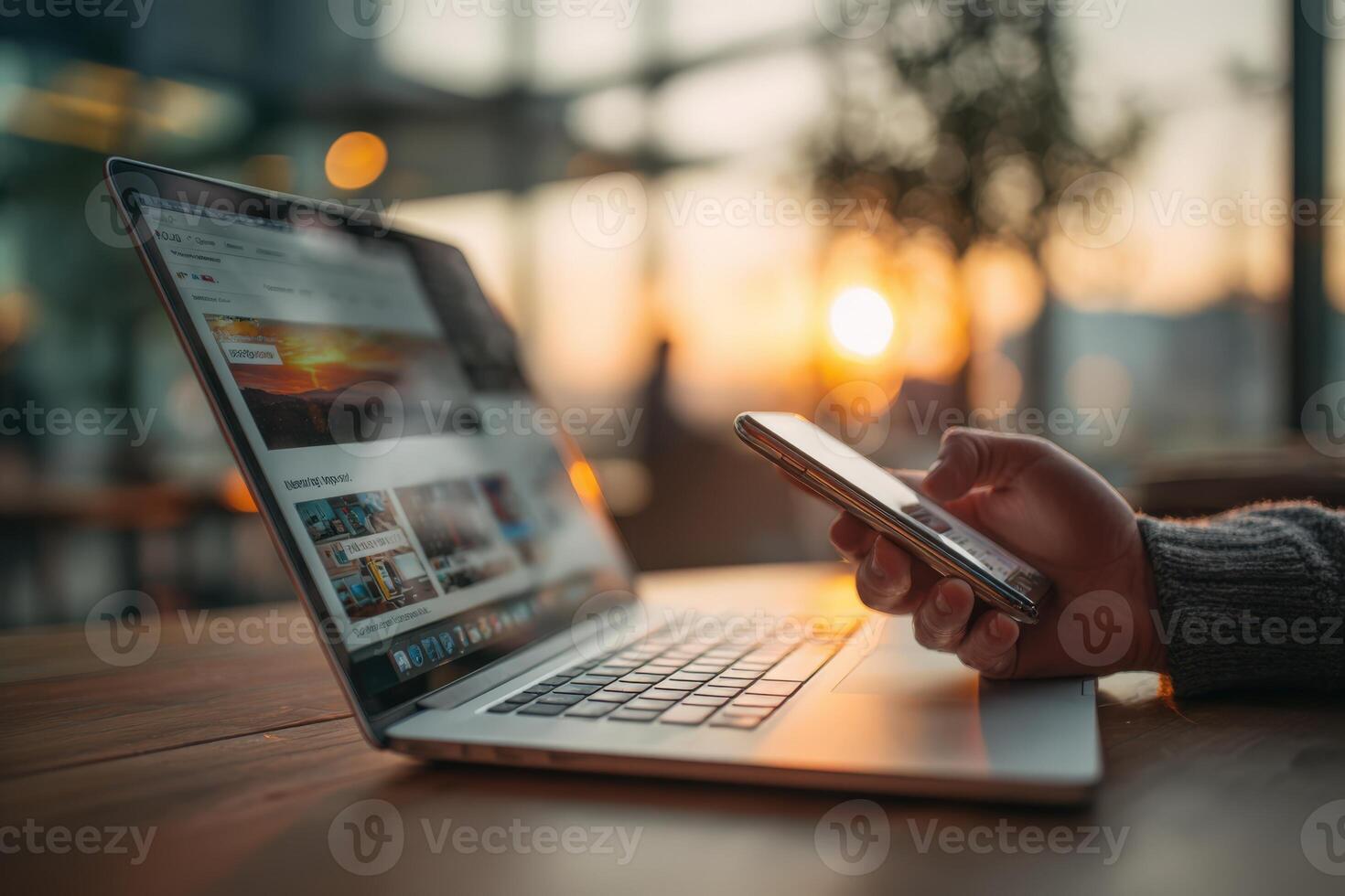 Individual holding smartphone while using laptop on wooden table, with warm sunset light illuminating workspace, creating a cozy and productive atmosphere for digital tasks Pro Photo