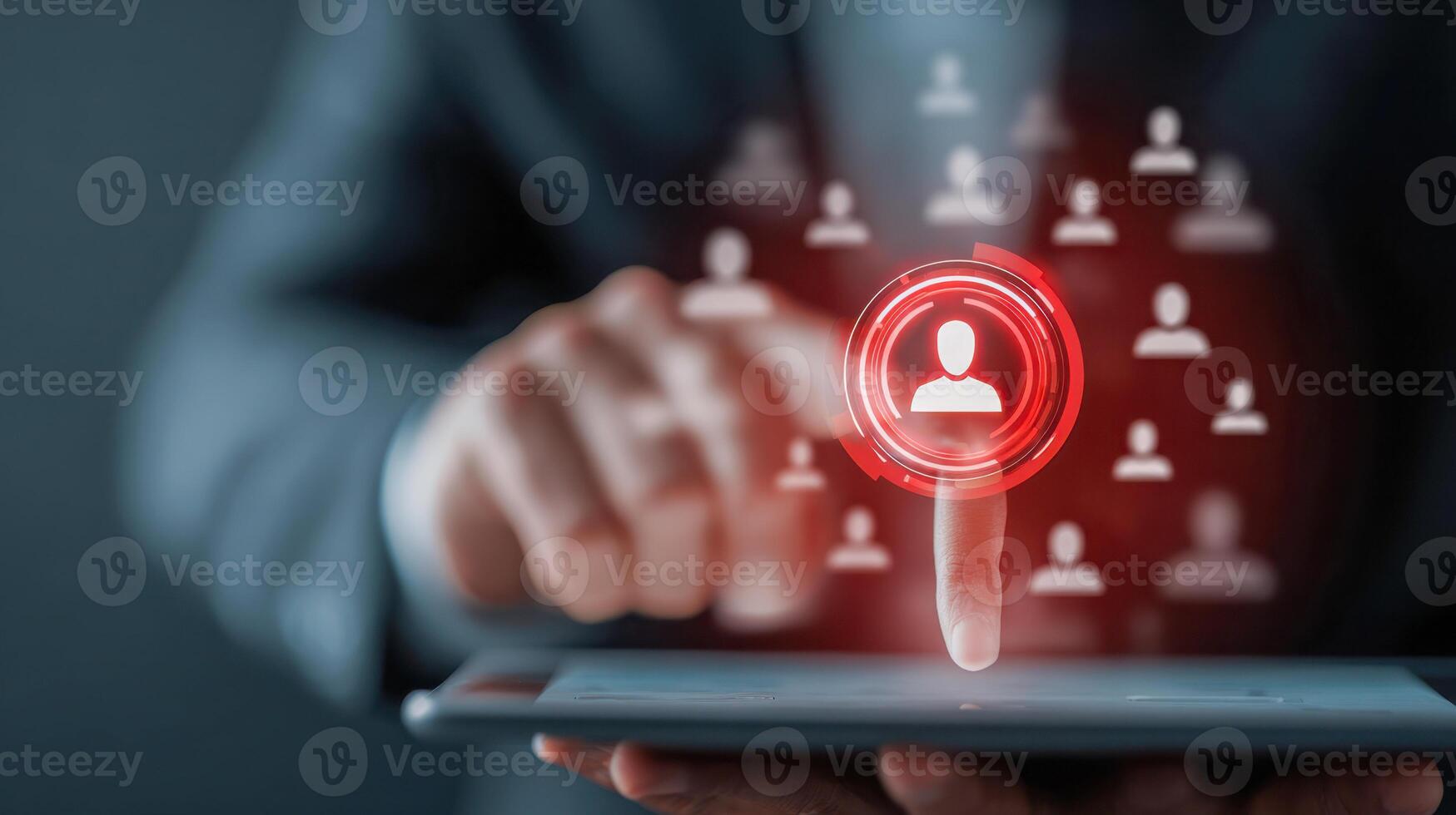 Businessman using digital tablet with virtual human resources interface featuring futuristic social network and employee selection concept in technology background Pro Photo