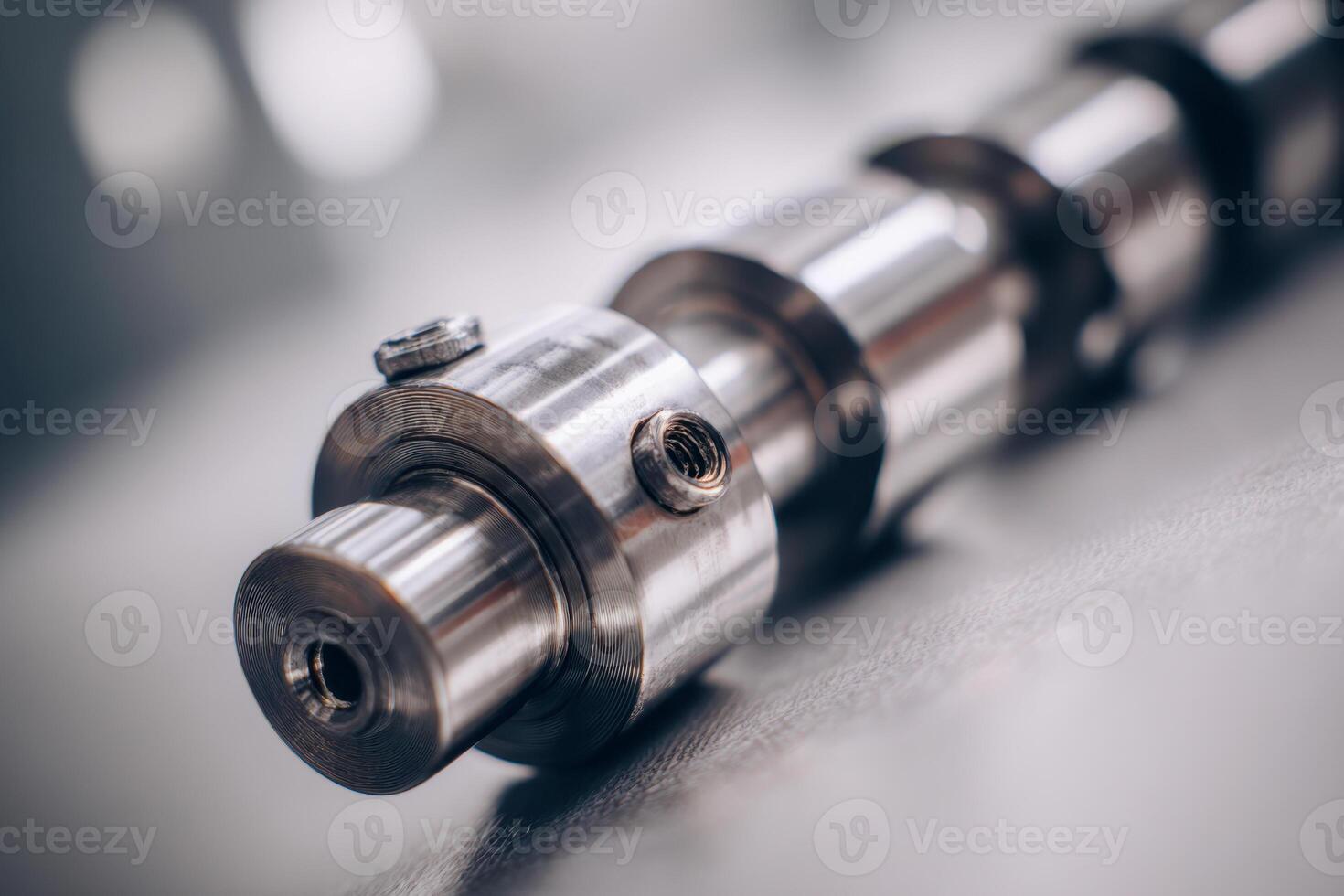 Close-up of a precision-engineered stainless steel camshaft component used in automotive engines resting on a smooth surface with a blurred background for focus effect Pro Photo
