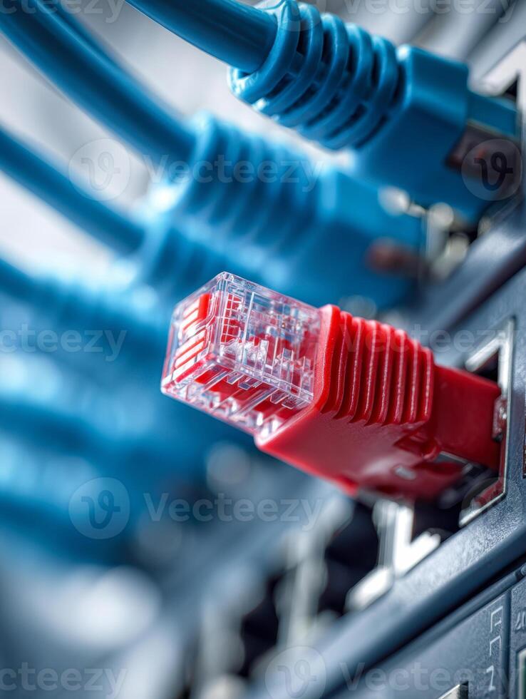 Red ethernet cable plugged into a network switch surrounded by multiple connected blue cables symbolizing connectivity and data transfer in technology systems Pro Photo