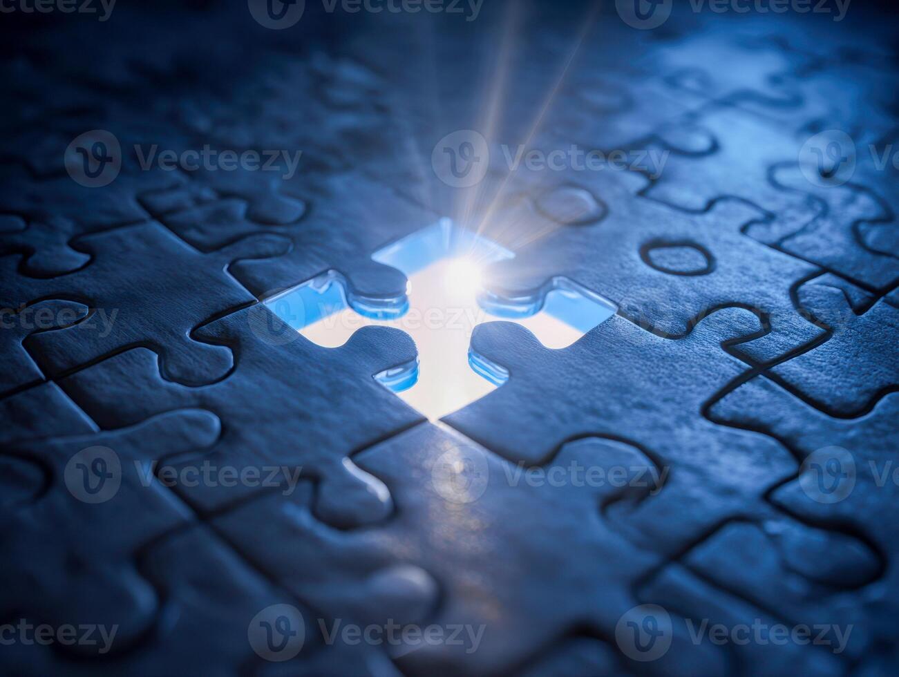 Illuminated missing piece in a dark blue jigsaw puzzle symbolizing discovery and the final step toward completing a challenging task or solving a mystery Pro Photo