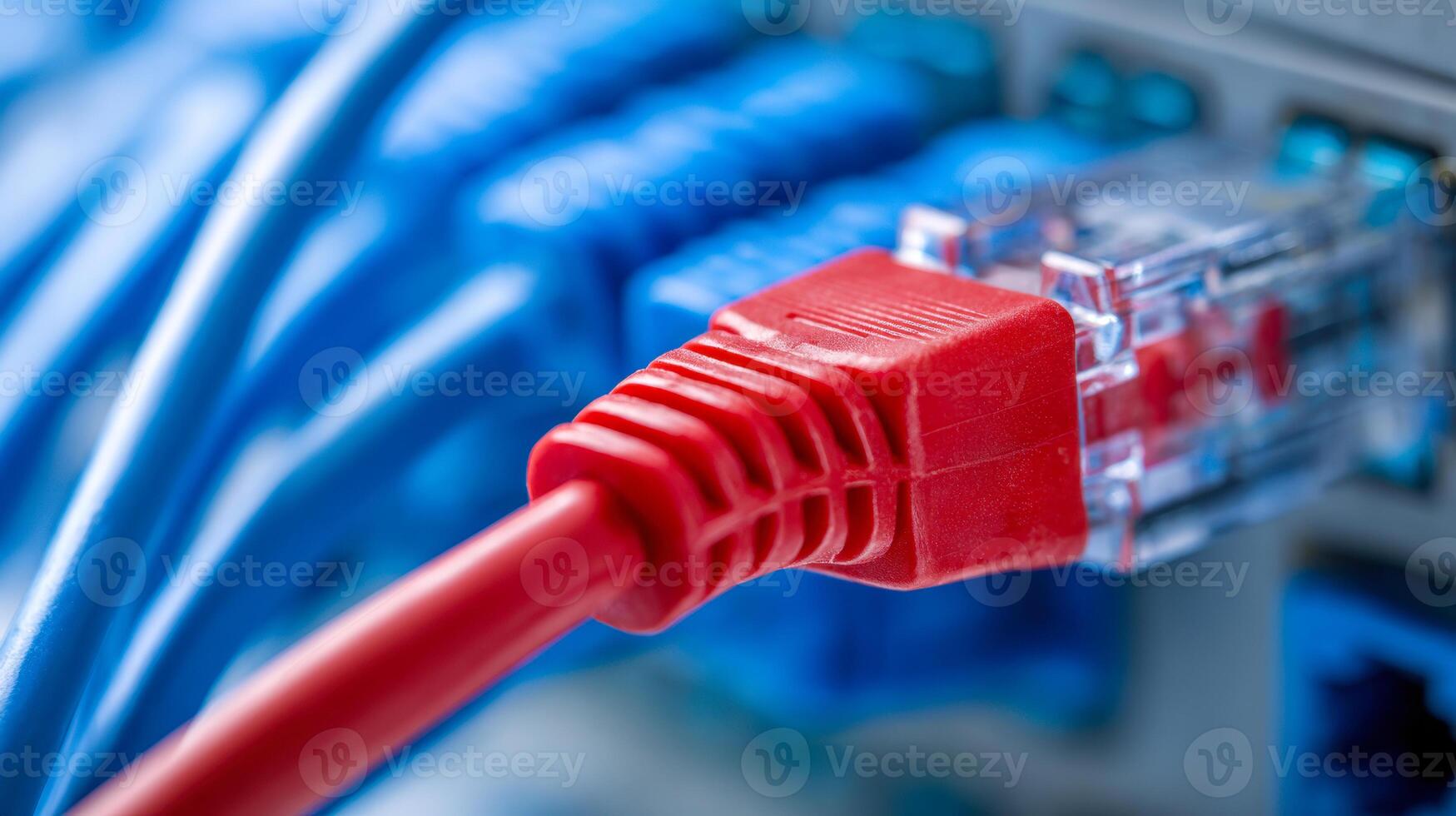 Red network cable plugged into a port on a computer switch with several blue Ethernet cables connected in the background for data communication and internet connectivity Pro Photo
