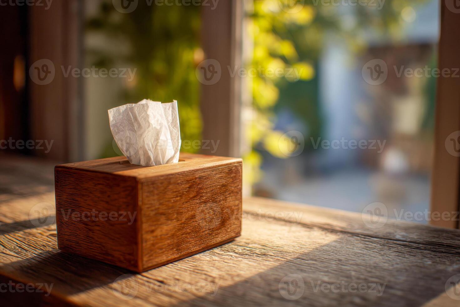 Wooden tissue box with a single tissue pulled out resting on a sunlit rustic wooden table near a window with blurred greenery in the background creating a warm cozy atmosphere Pro Photo