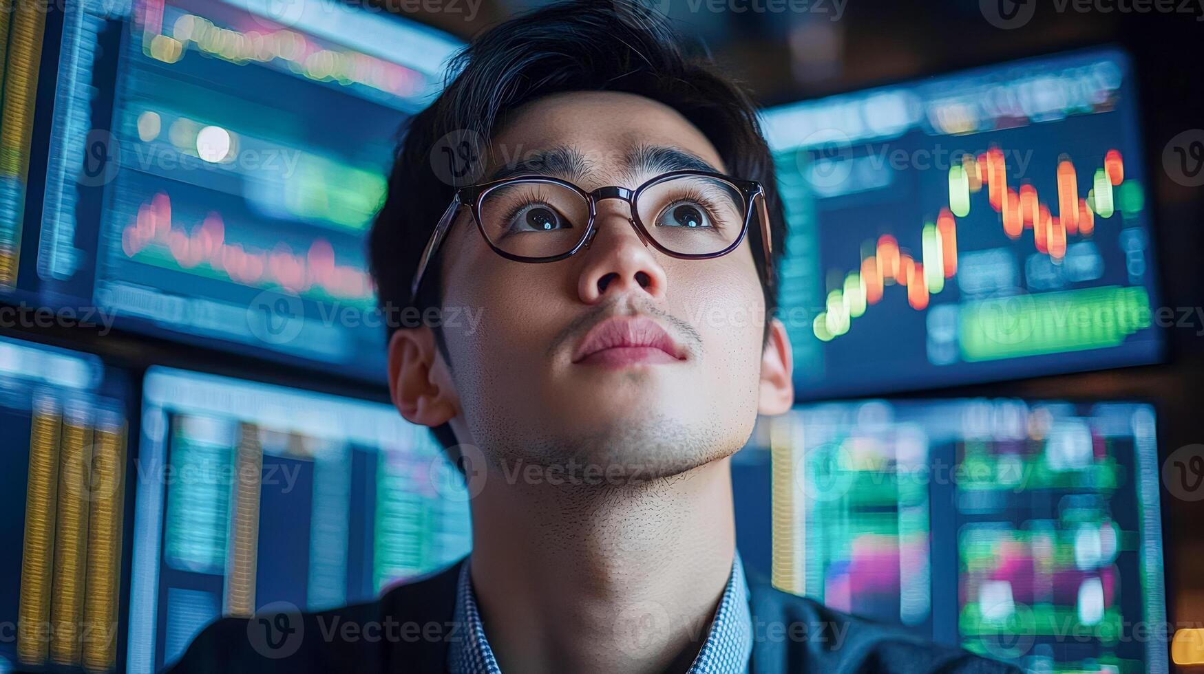 Young trader analyzing financial market data on multiple screens Pro Photo