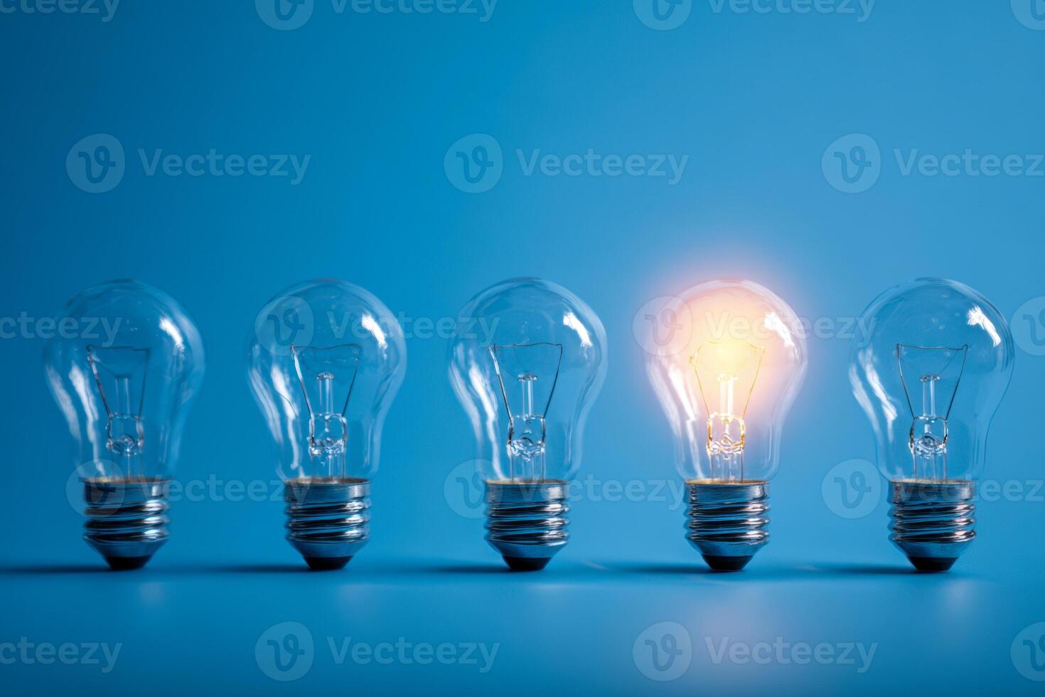Row of five clear light bulbs on a blue surface with one bulb illuminated symbolizing innovation and standing out from the crowd in a creative concept image Pro Photo