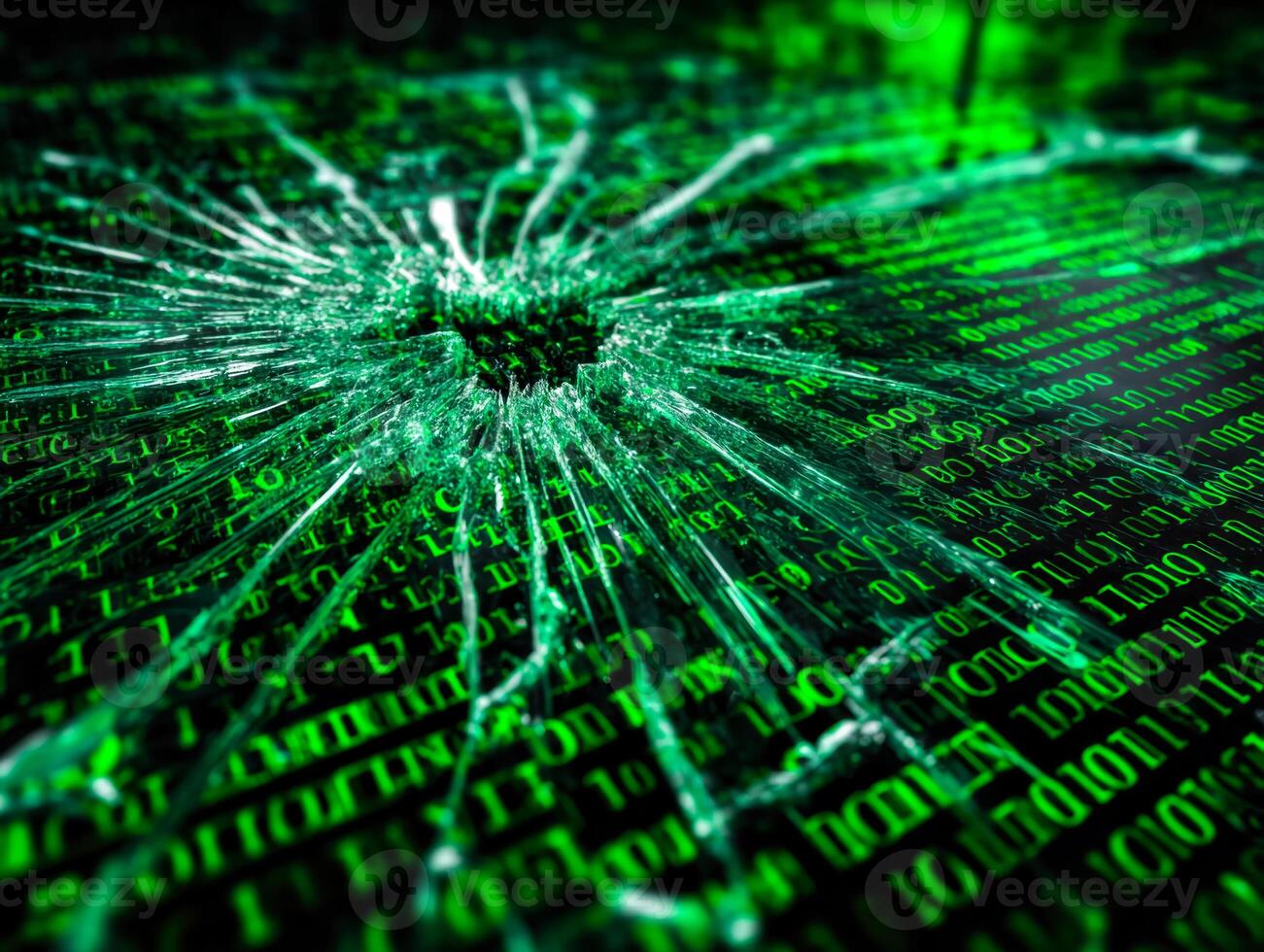 Digital data breach with shattered screen and cascading binary code Pro Photo