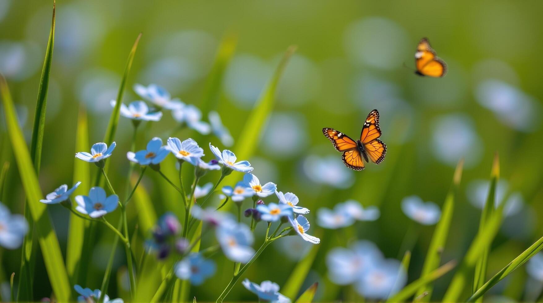 From a close-up perspective, the intricate details of forget-me-nots unfurl, showcasing their unique textures amid a backdrop of sheer green grass, as ethereal butterflies glide in slow Free Photo