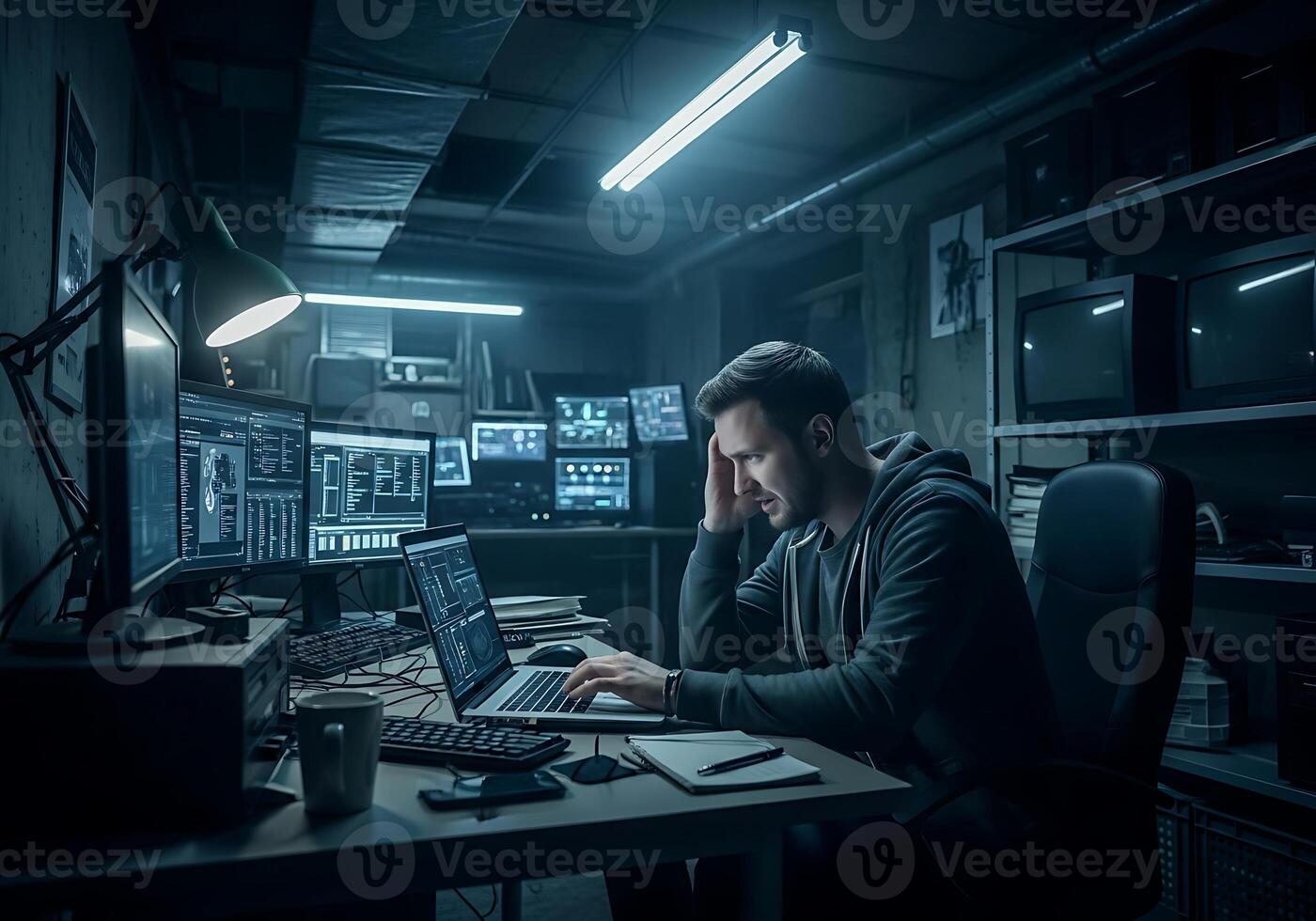 programmer burnout man working late tech professional overwhelmed by multiple screens Pro Photo