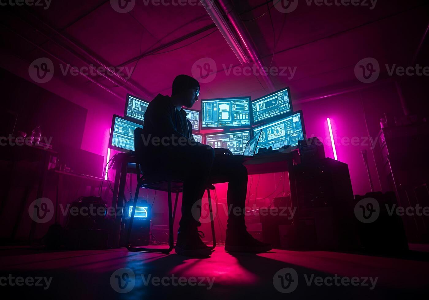 Man sitting in front of computer screens in dark room with pink lighting hacker concept Pro Photo