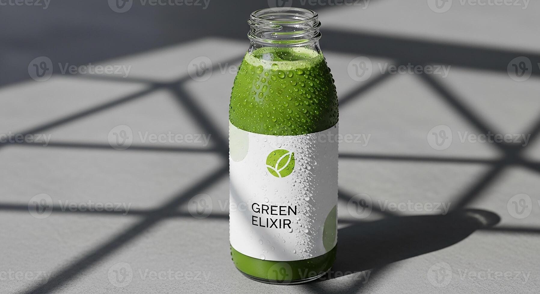 Green Elixir Juice Bottle with Shadow Pattern. Pro Photo