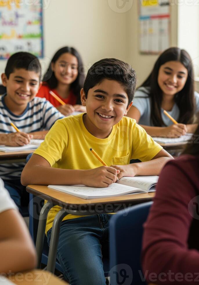 Joyful diverse students actively learning and smiling in a bright, modern classroom environment, engaged in schoolwork with pencils. Pro Photo