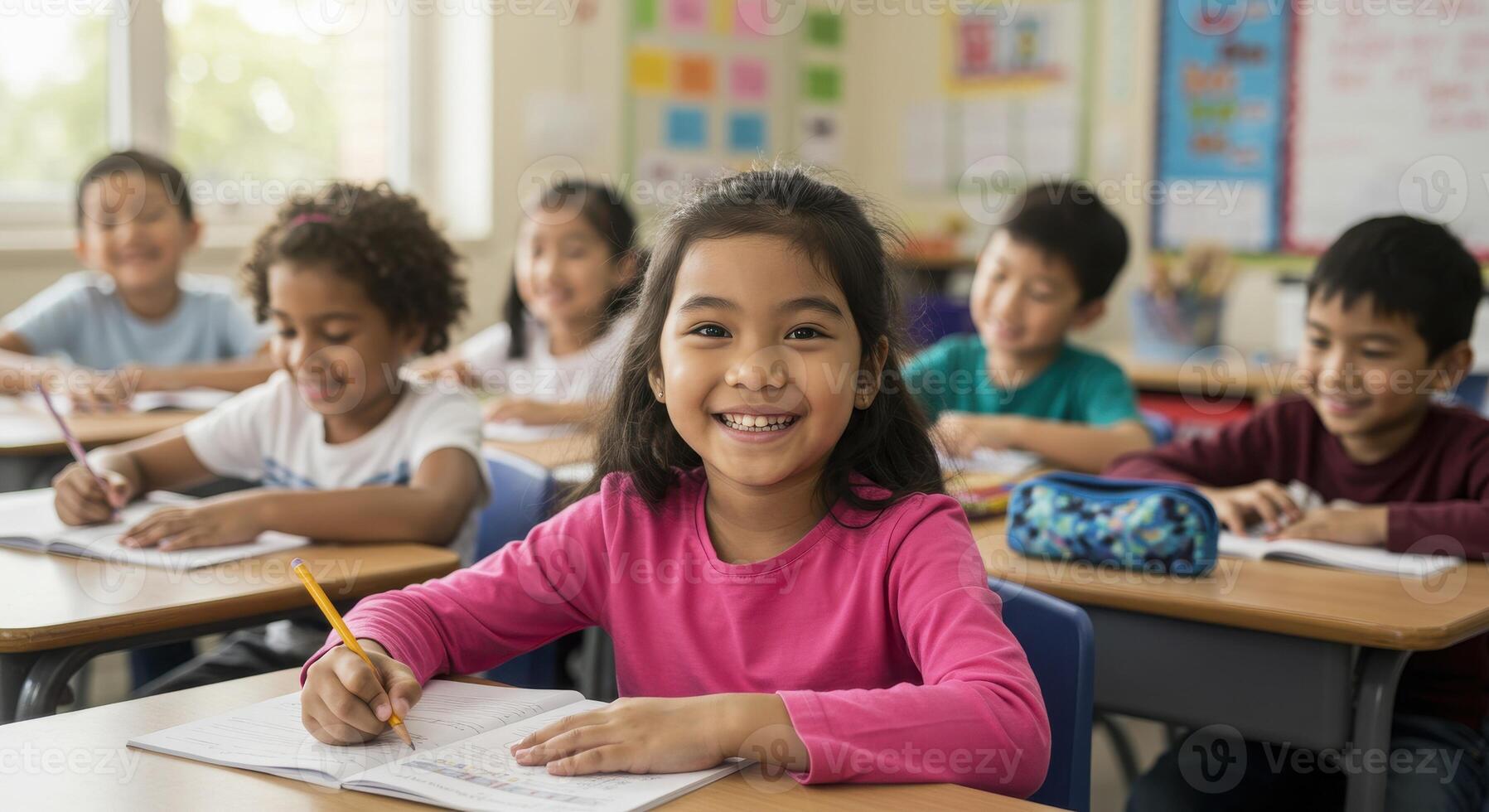 Joyful diverse elementary students engaged in learning and writing at desks in a bright, colorful classroom setting Pro Photo