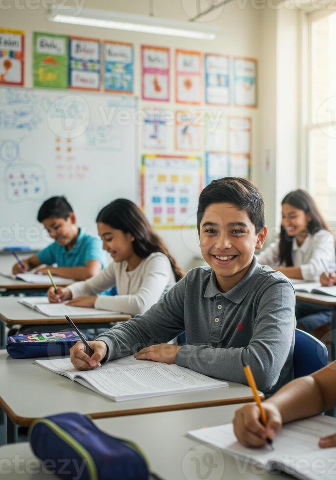 Joyful young student smiles confidently while learning and writing during a bright classroom lesson with classmates engaged in study Pro Photo