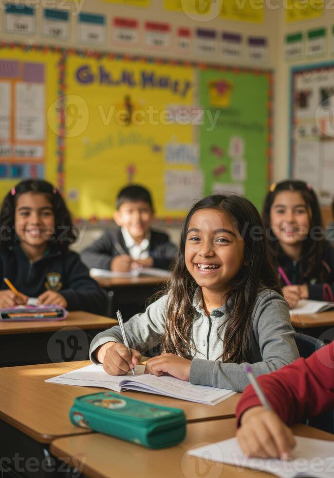 Joyful elementary students engaged in learning, smiling brightly while writing at desks in a vibrant classroom setting Pro Photo