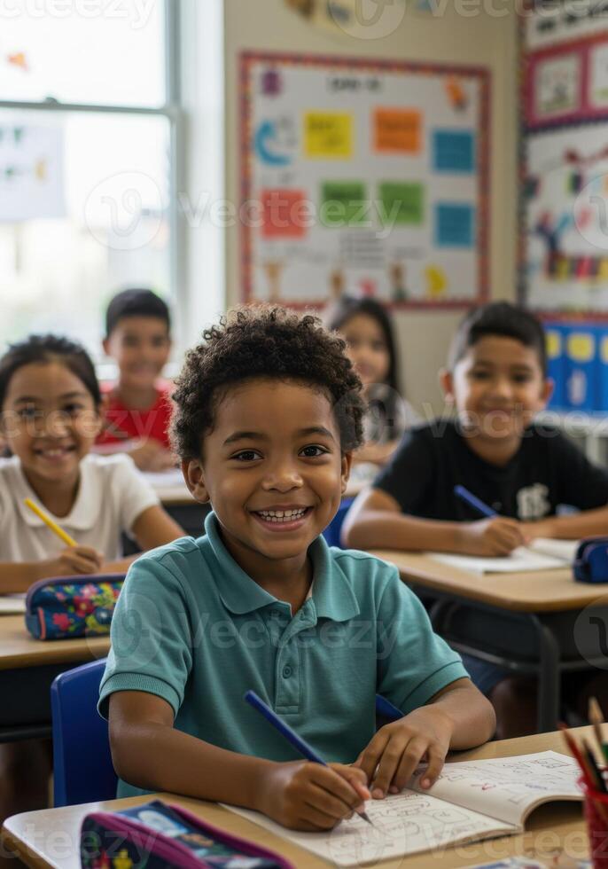 Joyful diverse elementary students engaged in learning, smiling brightly while writing at desks in a vibrant classroom setting Pro Photo