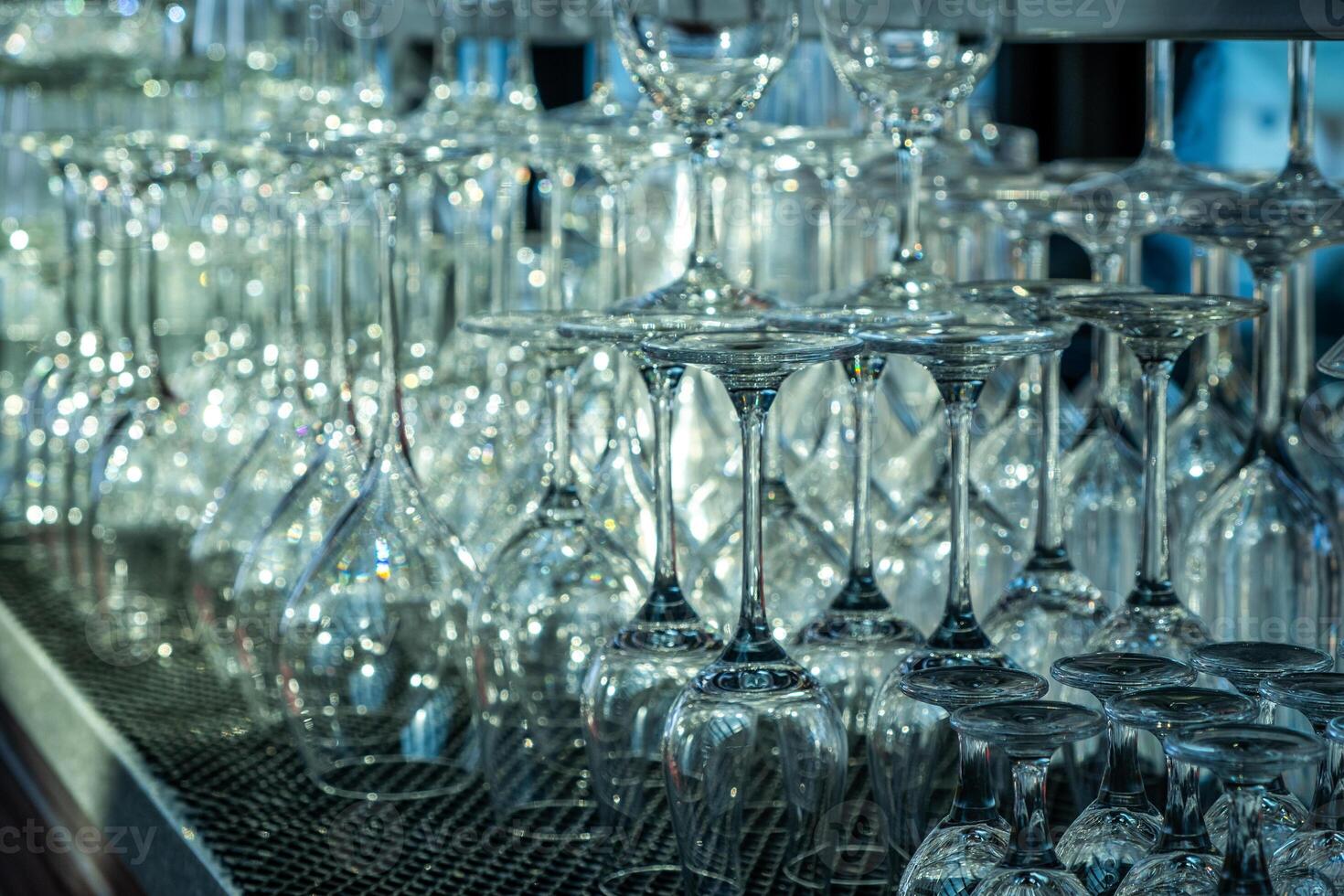 Collection of elegant glassware stacked in a bar setting, showcasing various shapes and sizes, reflecting light beautifully, creating a sophisticated atmosphere for dining experiences Pro Photo