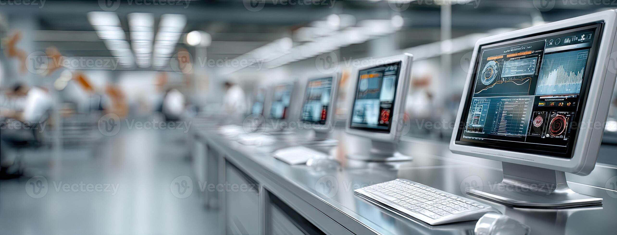 High-tech work environment with multiple computers displaying data analytics in a modern office setting during the day Pro Photo