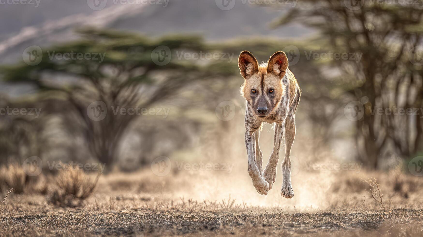 A dog running through the desert with a tree in the background Pro Photo