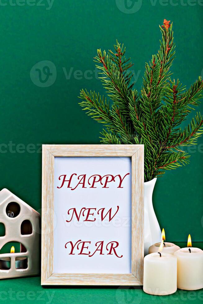 Happy New Year. Festive decoration showcases framed message reading Happy New Year, surrounded by candles and evergreen branches, creating warm and inviting atmosphere. Vertically Pro Photo