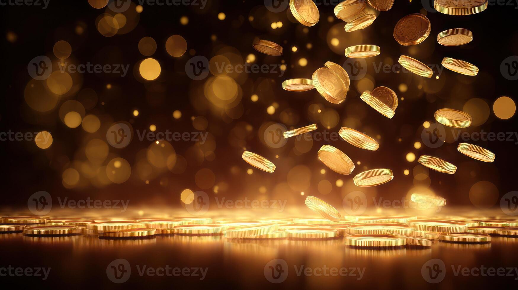 Golden coins falling in front of a dark background with blurred bokeh Pro Photo