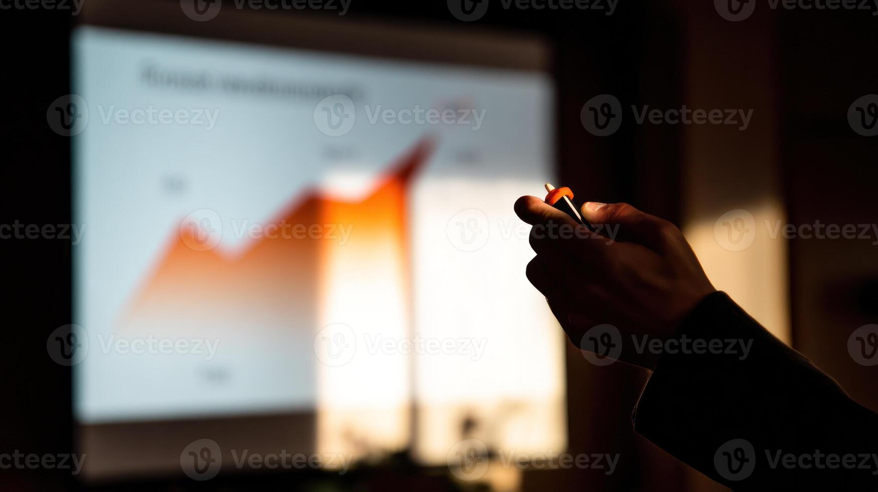 Presentation in progress with hand holding remote and projected graph Pro Photo