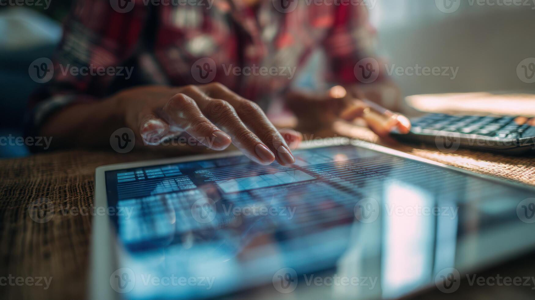 Womans hand interacting with tablet screen displaying data and information Pro Photo