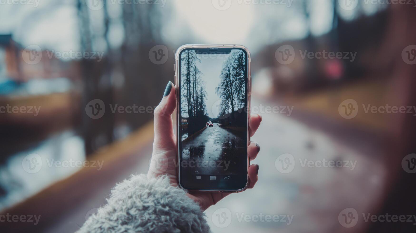 Smartphone displaying image of road through trees with bokeh effect Pro Photo