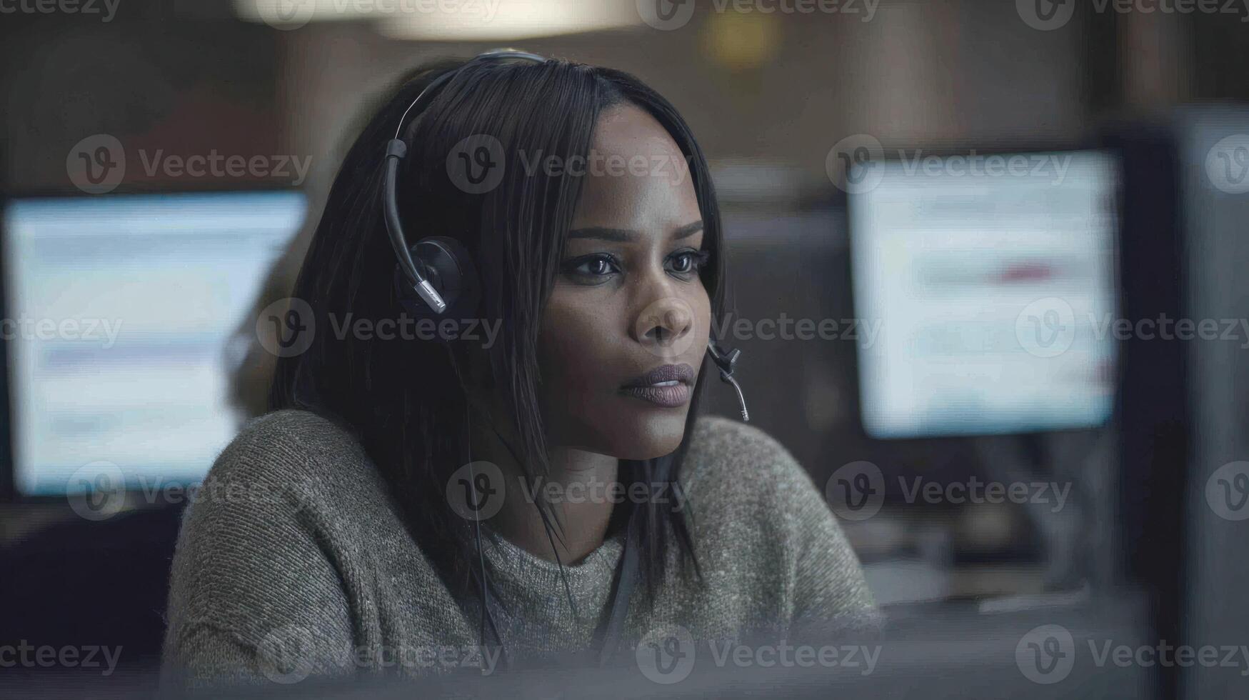 Woman using headset in office setting with computer screens Pro Photo