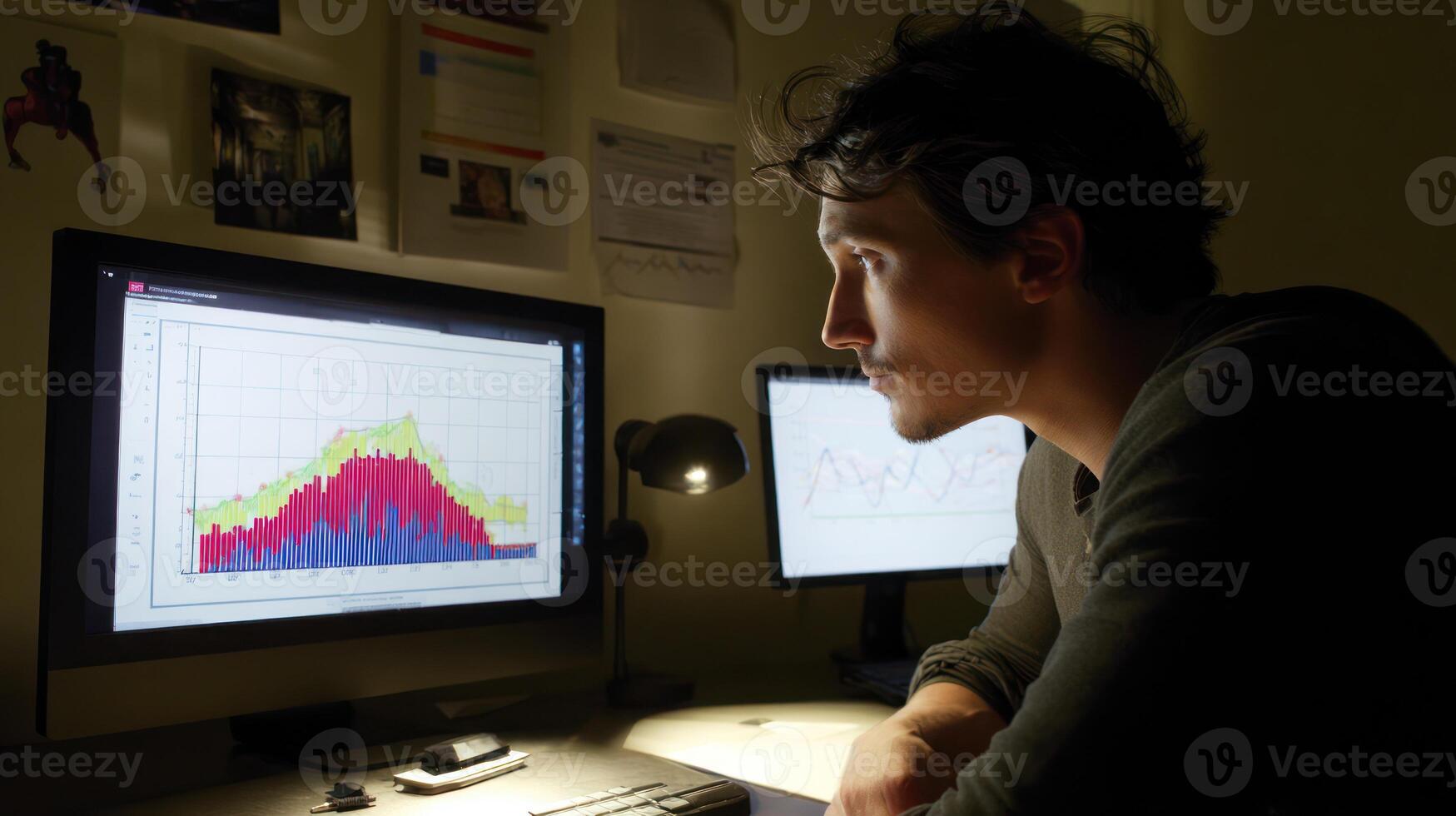 Man analyzing data on computer monitors indoors at night Pro Photo