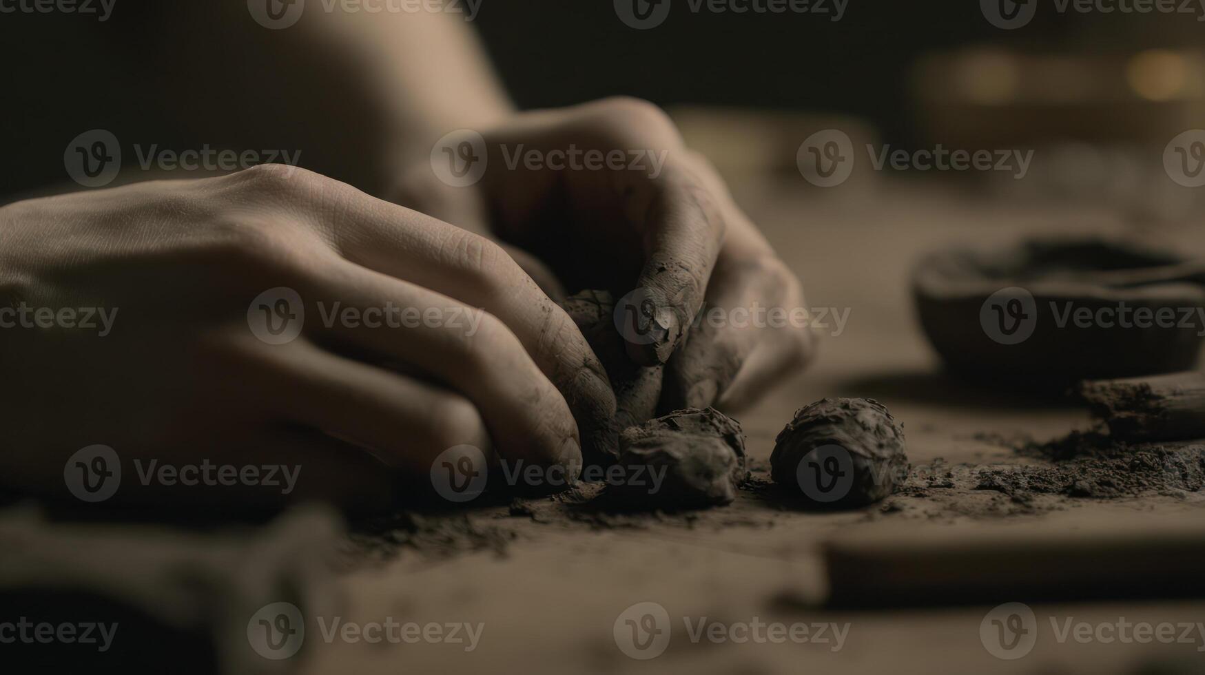 Hands working with clay creating pottery indoors with natural light Pro Photo