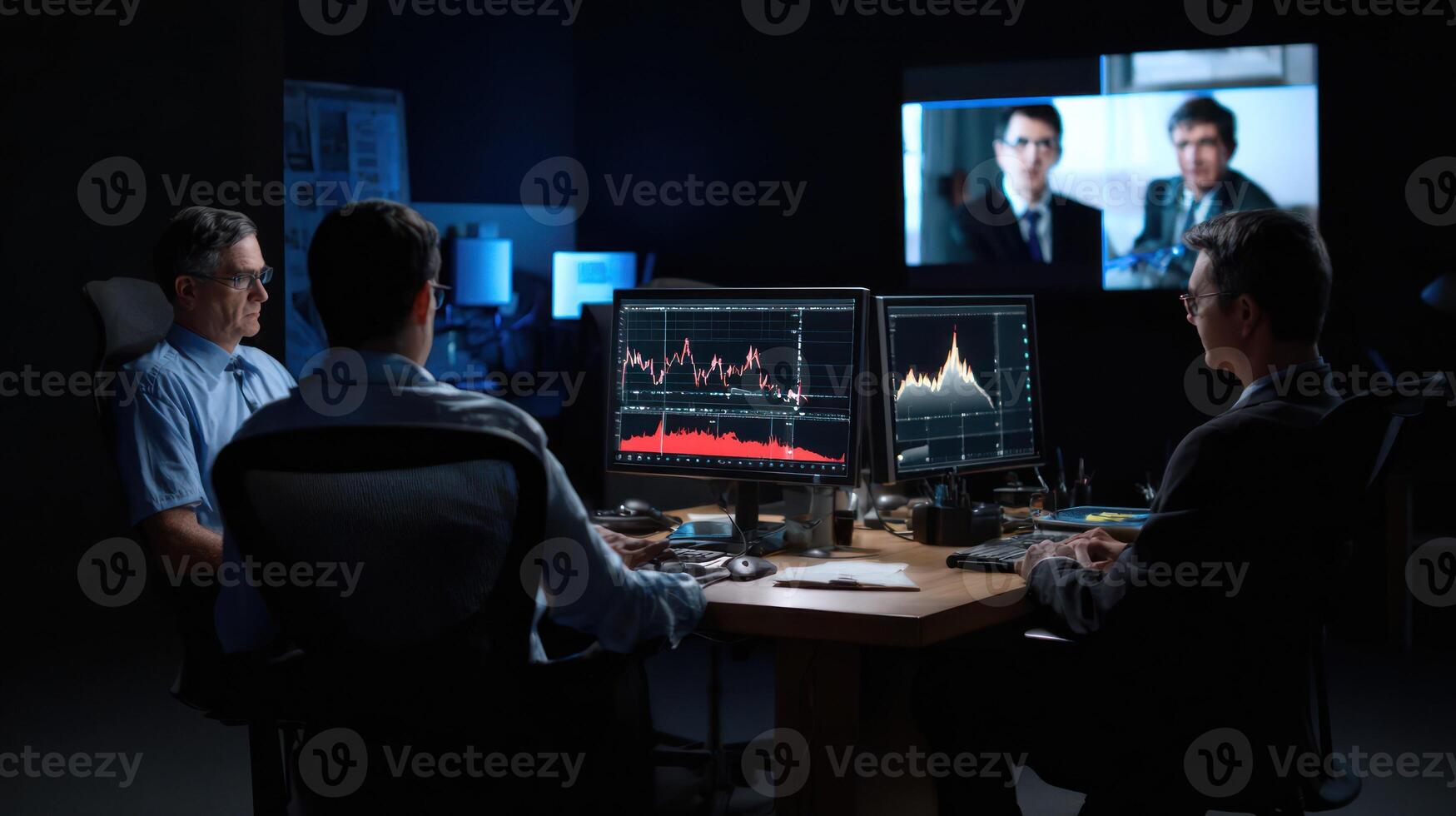 Business team analyzing data on computer screens during conference Pro Photo