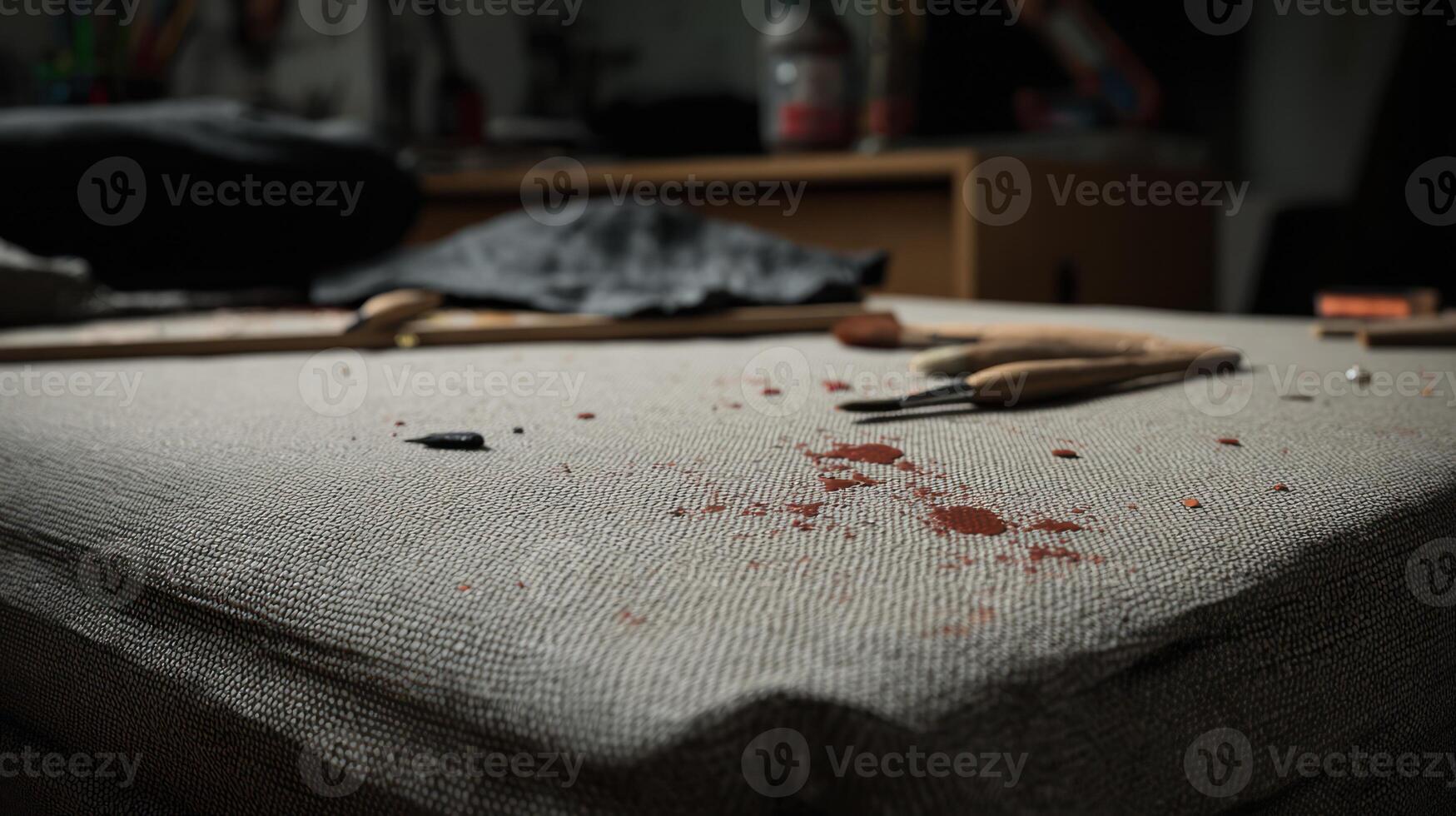 Close up of a blood stained cloth on a table with tools and objects Pro Photo
