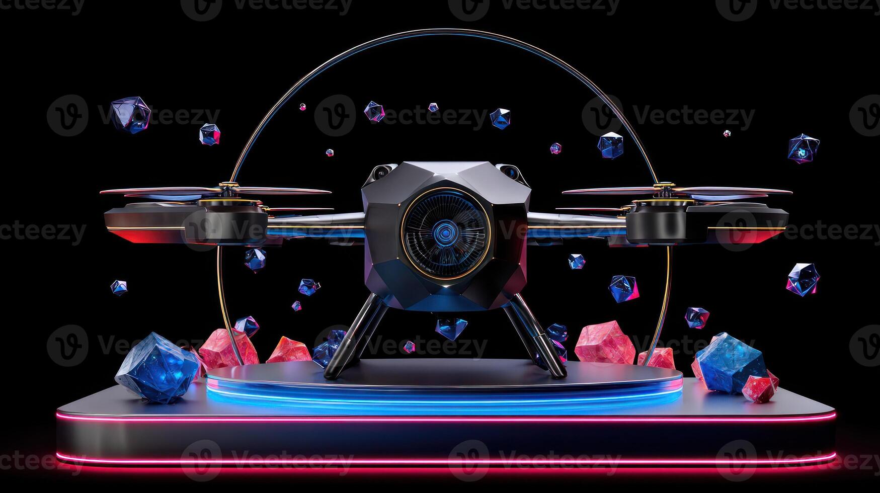 Modern drone on illuminated platform with abstract geometric elements Pro Photo