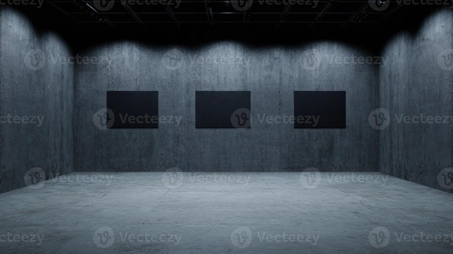 Minimalist gallery space with empty frames and concrete textured walls Pro Photo