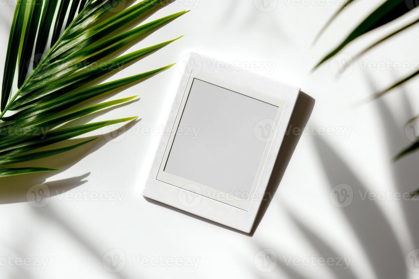 A stylish mockup features a blank Polaroid frame centered on a white background, surrounded by green palm leaves, perfect for showcasing memories Pro Photo