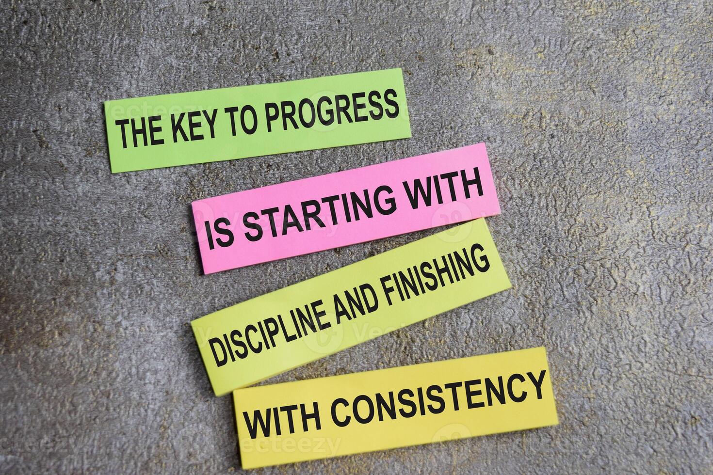 Concept of the key to progress is starting with discipline and finishing with consistency write on sticky notes isolated on Wooden Table. Pro Photo