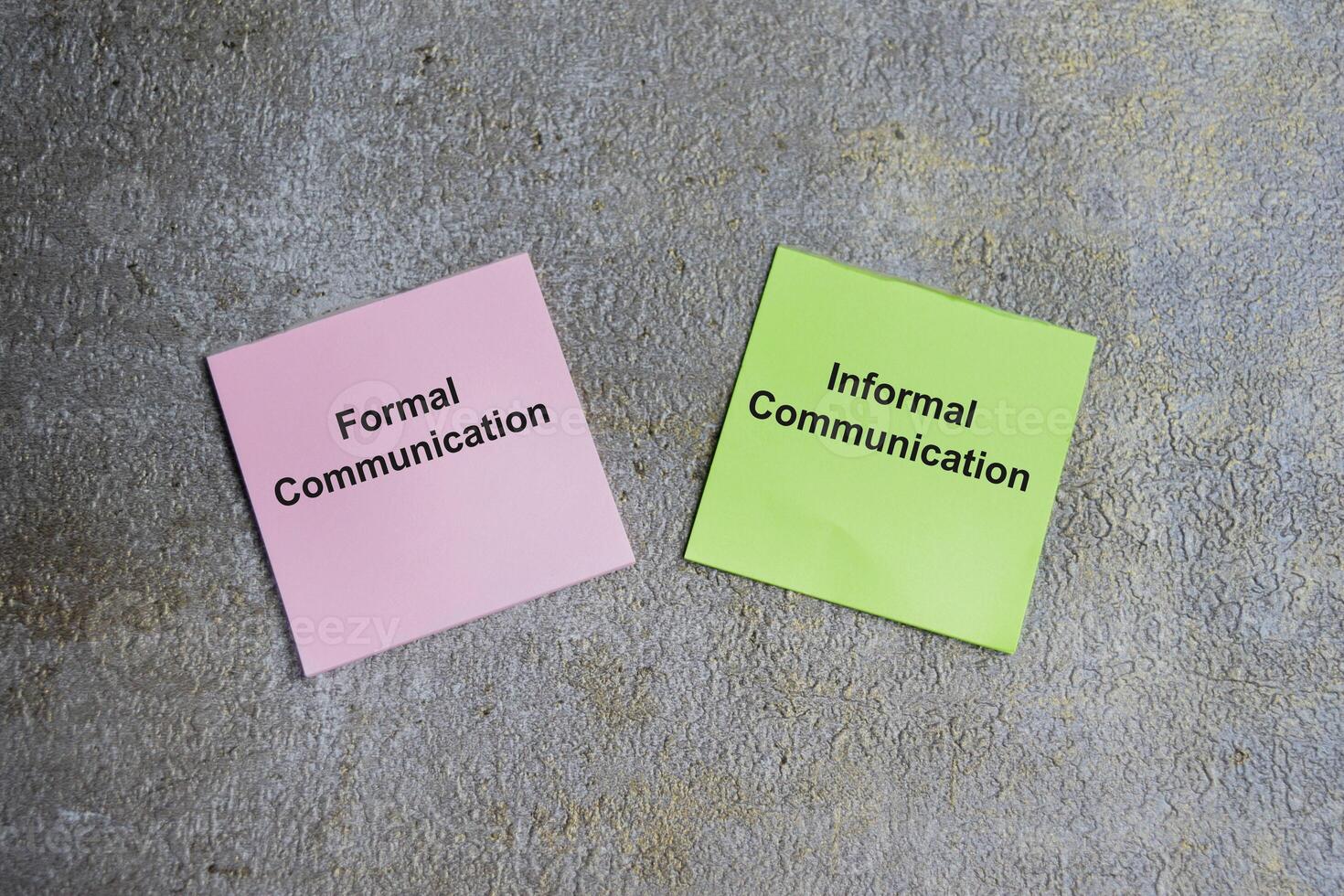 Concept of formal communication or informal communication write on sticky notes isolated on Wooden Table. Pro Photo