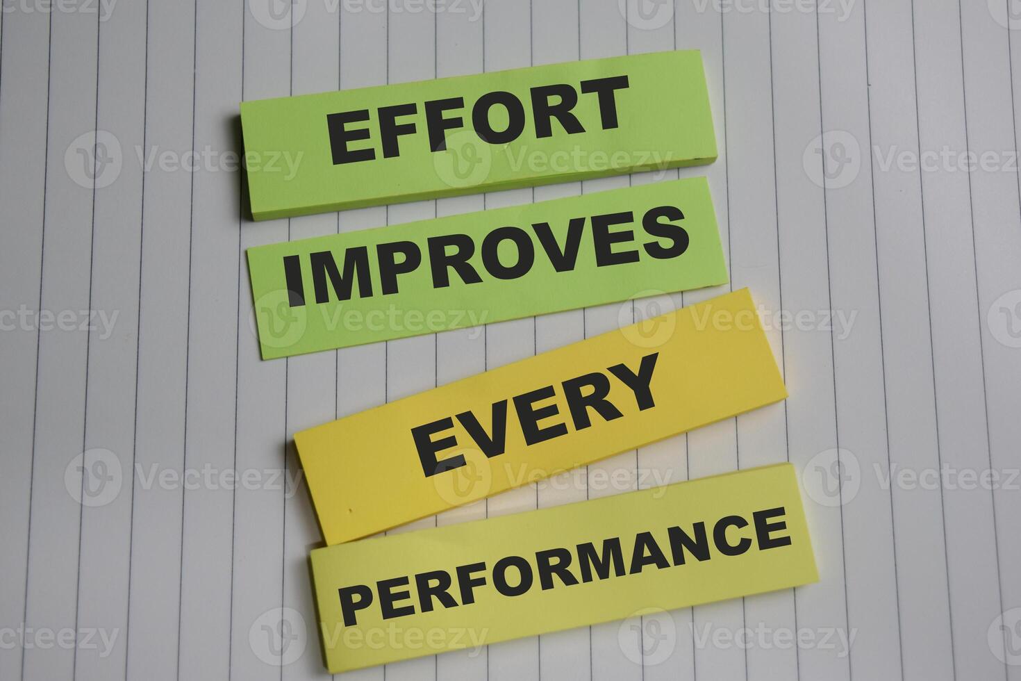 Concept of effort improves every performance write on sticky notes isolated on Wooden Table. Pro Photo