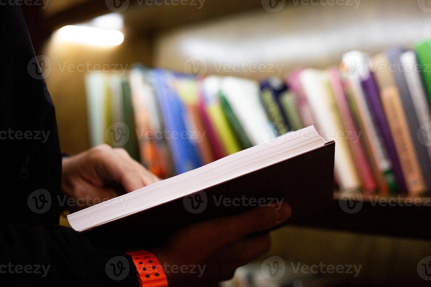 Close up of person holding book in library setting. The photo highlights moment of reading, with shelves full of books in background, creating calm intellectual atmosphere Pro Photo