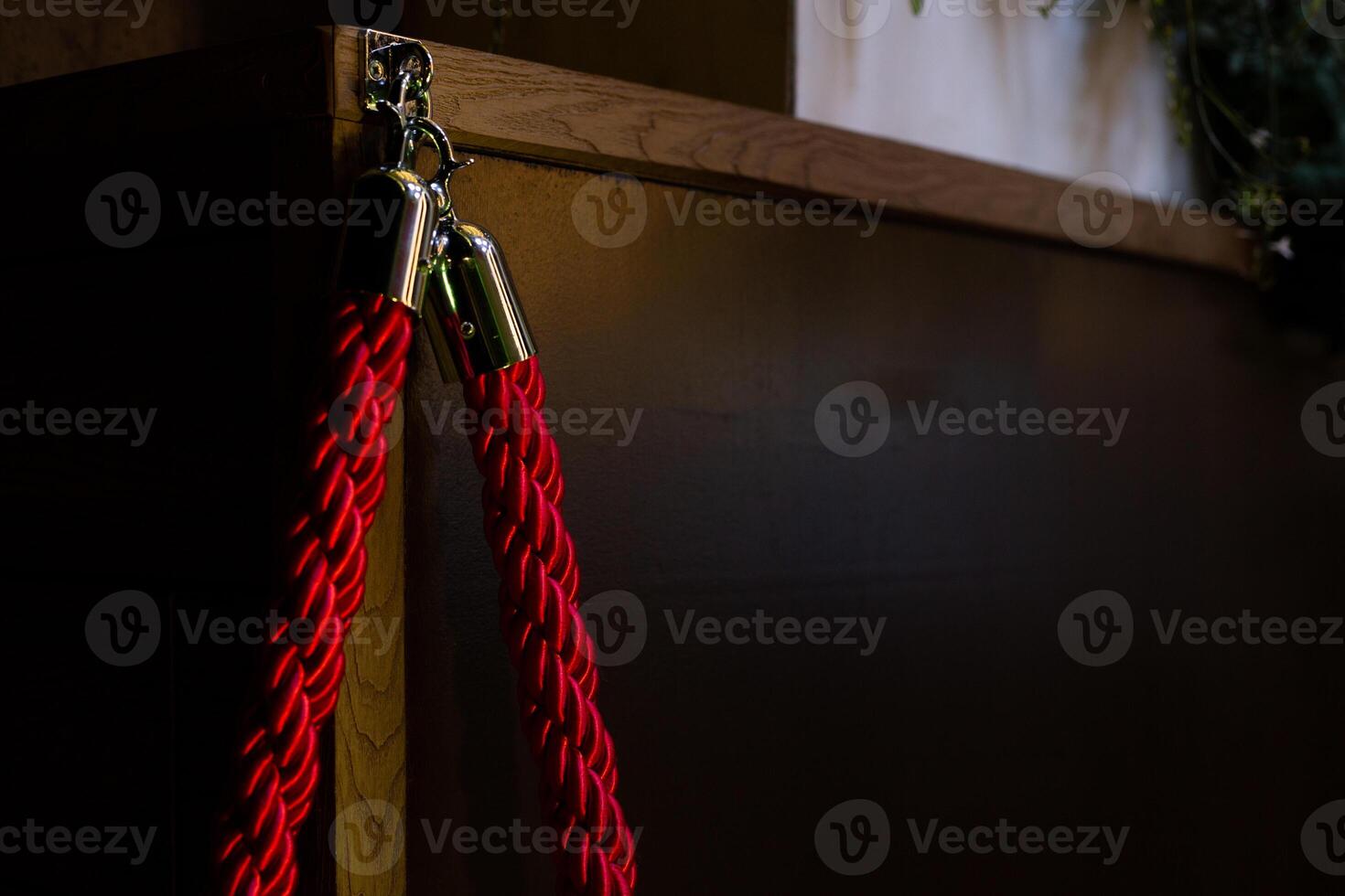 Red velvet rope attached to polished metal hook, commonly used for crowd control or marking boundaries. Texture of rope contrasts with dark background, creating sophisticated and elegant atmosphere Pro Photo