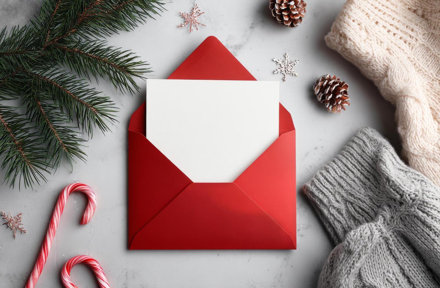 An open envelope with a blank card and candy canes on a gray background Free Photo