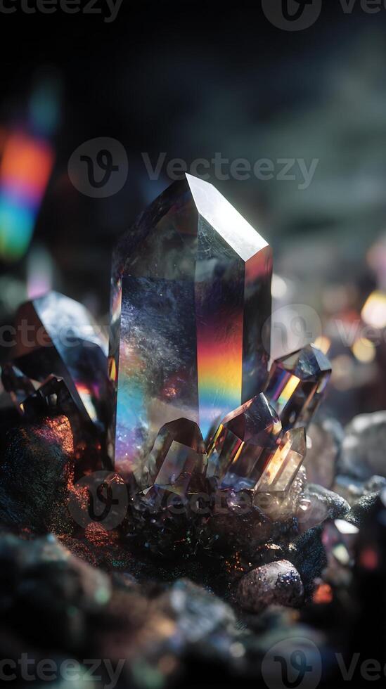 Prismatic crystal array reflecting ethereal light within a dark geological setting Pro Photo
