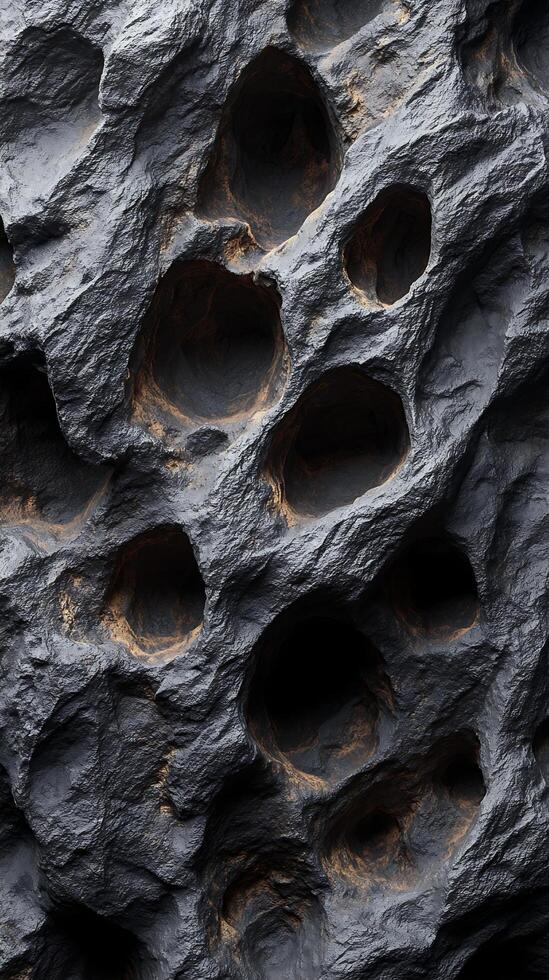 Intricate patterns and dark voids etched within a rough stone surface create depth photo