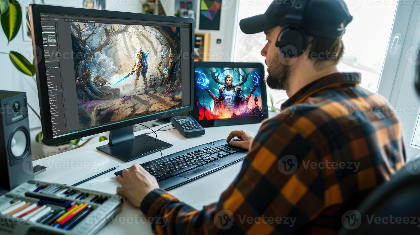 A man is sitting at a desk with two monitors and a computer Pro Photo