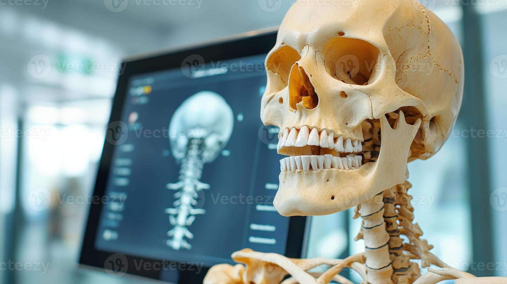 a human skeleton is shown in front of a computer monitor Pro Photo