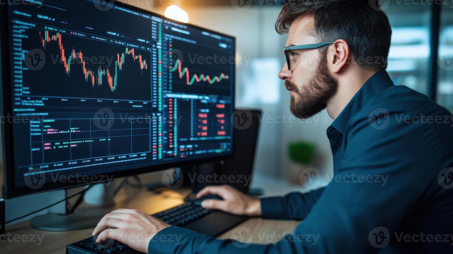A man is sitting in front of two computer monitors, one of which is displaying a stock market graph. He is wearing glasses and he is focused on the screen Pro Photo