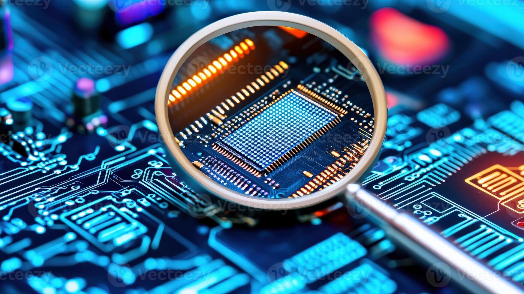 A close up of a computer chip with a magnifying glass on it Pro Photo