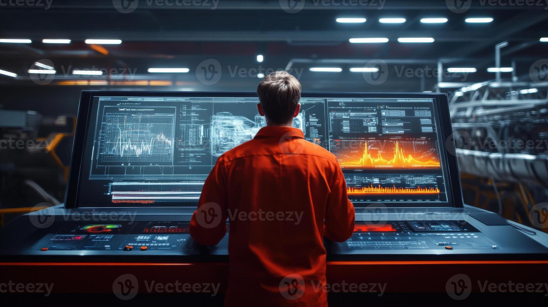 technician in orange jumpsuit analyzes data on digital control panel, surrounded by advanced machinery and screens displaying graphs and metrics Pro Photo