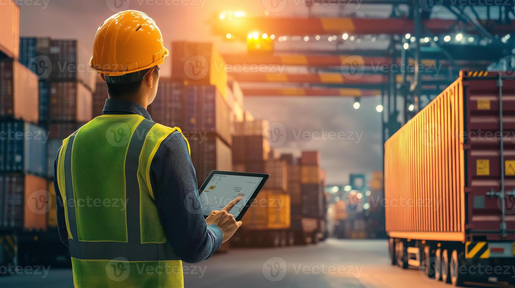 a man in a hard hat holding a tablet computer in front of a container Pro Photo